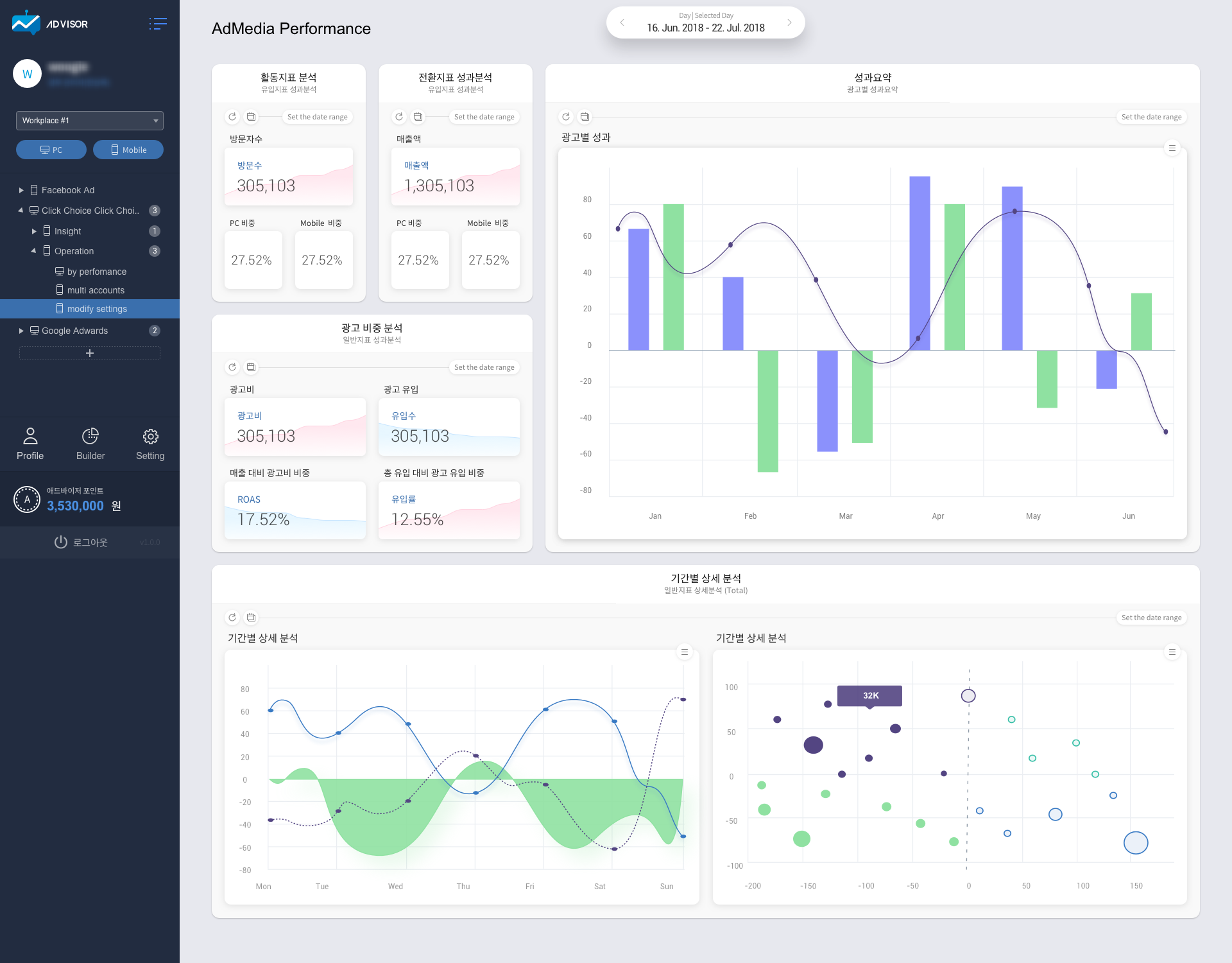 애드바이저의 강점은 데이터 분석과 AI를 활용한 광고 운영 자동화에 있다. 우선 데이터 분석의 경우, 애드바이저는 광고 매체 뿐만 아니라 클라이언트 등의 다양한 자료를 활용하여 다양한 각도로 데이터를 분석, 객관적이고 표준화된 성과 자료는 물론이고 기존에 존재하지 않는 분석 자료를 제공할 수 있으며 복잡한 조건의 분석 데이터 비교까지 제공한다.