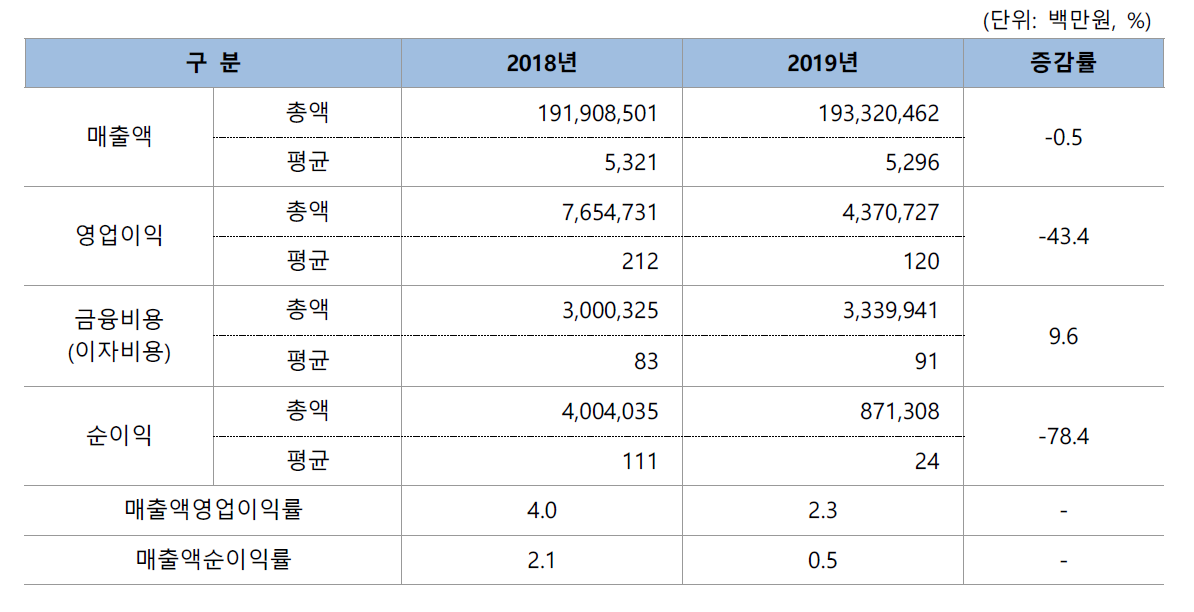 현대자동차(179조), SK(161조), LG(122조) 등 주요 대기업 매출액을 뛰어넘은 결과로, 평균 매출액은 52억 9,600만 원으로 전년 대비 0.47% 소폭 하락했으나, 2019년도 우리나라 경제성장률 감소(-0.9%) 및 대기업 평균 매출액 하락(-7.2%) 등을 감안 하면 선방한 수준이다. 매출구성비는 B2B가 75.4%로 가장 높았고, B2G 14.3%, 해외 매출 6.0%, B2C 4.3% 순으로 나타났다.