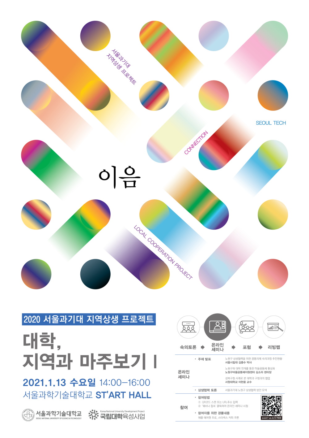 ◇[1월13일 수요일] = 대학, 지역과 마주보기Ⅰ- 대학, 지역 상생의 길을 묻다 = 사단법인 이음이 주최하는 대학, 지역과 마주보기Ⅰ- 대학, 지역 상생의 길을 묻다가 오는 1월 13일 수요일 14시에 진행된다. 온라인 웨비나로 진행되는 이번 행사는 ‘2020 서울과기대 지역상생 프로젝트’의 일환이다. 이번 행사에는 세 연사의 주제 발표 및 상생협력 토론이 진행된다. 연사별 발표 주제로는 △서울시립대 김종수 박사 ‘노원구 상생협력을 위한 공동의제 숙의과정 추진현황’, △노원구마을공동체지원센터 김소라 센터장 ‘노원구와 대학 연계를 통한 마을공동체 활성화’, △서원대학교 이현웅 교수 ‘성북구청 사례로 본 대학과 구청과의 협업’이 있다. 상생협력 토론은 ‘서울과기대 노원구 상생협력 방안 모색’을 주제로 진행된다. 이번 행사는 관심 있는 누구나 참여 가능하다. 웨비나에 대한 자세한 내용 확인과 참가 신청은 이곳에서 할 수 있다.
