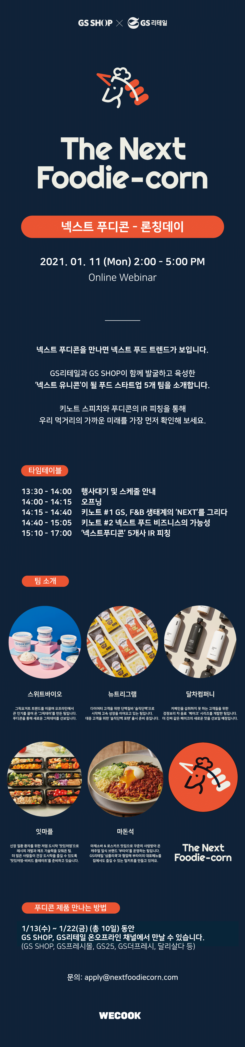 ◇[1월 11일 월요일] = [GS X 위쿡] 넥스트푸디콘 1기 – 론칭데이 = GS리테일과 GS홈쇼핑이 함께하는 [GS X 위쿡] 넥스트푸디콘 1기 – 론칭데이가 오는 1월 11일 월요일 14시에 진행된다. 온라인 웨비나로 진행되는 이번 행사는 GS리테일과 GS홈쇼핑이 직접 선발하고 육성한 푸드계의 넥스트 유니콘 5개 팀을 만날 수 있는 자리다. 이번 행사에는 넥스트 푸디콘 5개사의 IR 피칭 이외에도 키노트 스피치가 별도로 진행된다. 키노트 스피치는 ‘GS, F&B 생태계의 ‘NEXT’를 그리다.’, ‘넥스트 푸드 비즈니스의 가능성’을 주제로 진행된다. 이번 행사는 관심 있는 누구나 참여 가능하다. 웨비나에 대한 자세한 내용 확인과 참가 신청은 이곳에서 할 수 있다.