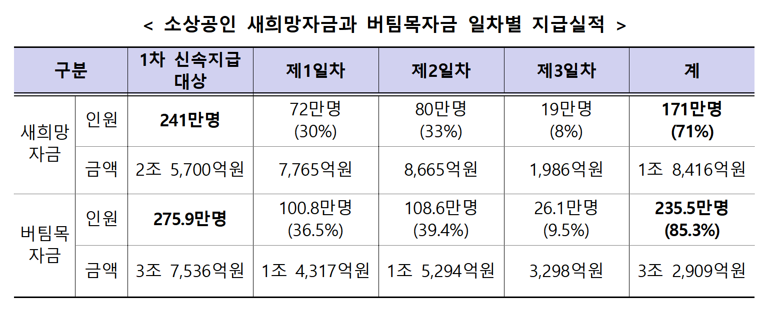 중소벤처기업부(장관 박영선, 이하 중기부)는 11~13일 사흘간 버팀목자금을 신청한 236만명에게 3조 2,909억원을 지급했다고 14일 밝혔다.