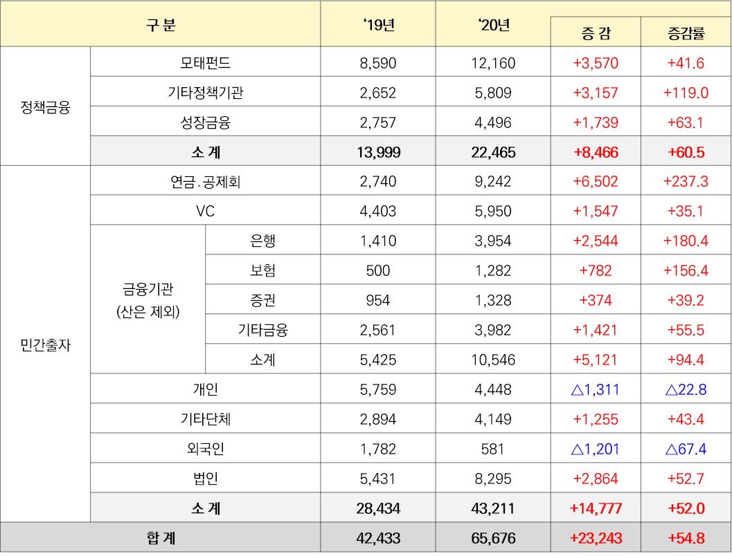 ‘20년 벤처펀드 신규결성에 대한 출자자 현황을 살펴보면, 모태펀드 등 정책금융 부문 출자가 약 2조 2,465억원, 민간부문 출자가 4조 3,211억원인 것으로 파악됐다.