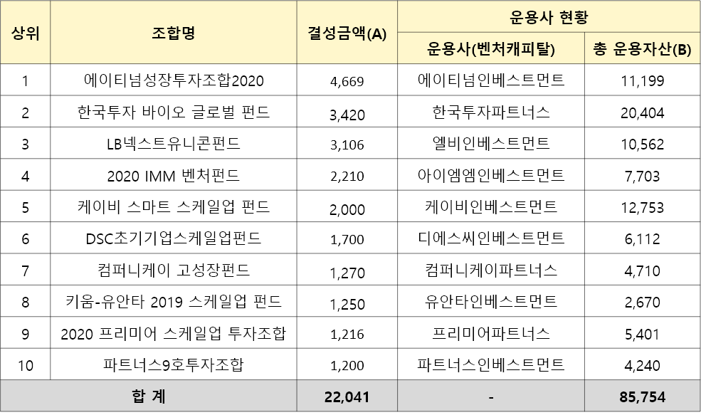 이 중 최대규모의 펀드는 4,669억원으로 결성된 ’에이티넘 성장투자조합 2020‘으로, 종전 최대결성 펀드(약 3,500억원, 에이티넘)보다 약 1,100억원 이상 큰 규모였다.