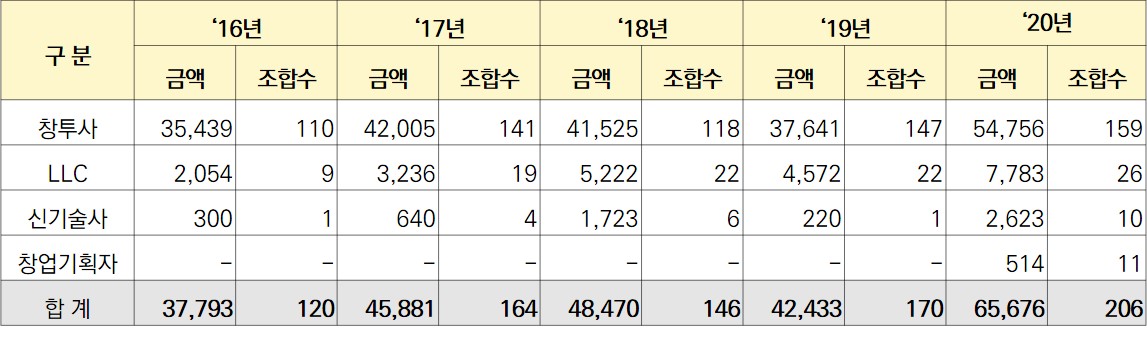 작년 벤처펀드 결성이 2019년 대비 54.8% 늘어난 6조 5,676억 원으로 집계됐다. 신규 결성 조합 수도 역대 최다인 206개로 종전 최대 결성 실적인 2018년 4조 8,470억 원을 갱신한 역대 최대 결성 수치를 기록했다.