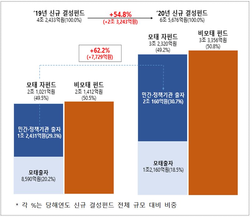 ‘20년 모태 자펀드 결성액은 3조 2,320억원으로, 전체 펀드 결성액 (6조 5,676억원) 중 약 49.2%를 차지했으며, 이는 ’19년 전체 펀드 결성액 대비 비중(49.5%)보다 약 0.3%p 감소한 수준이다.
