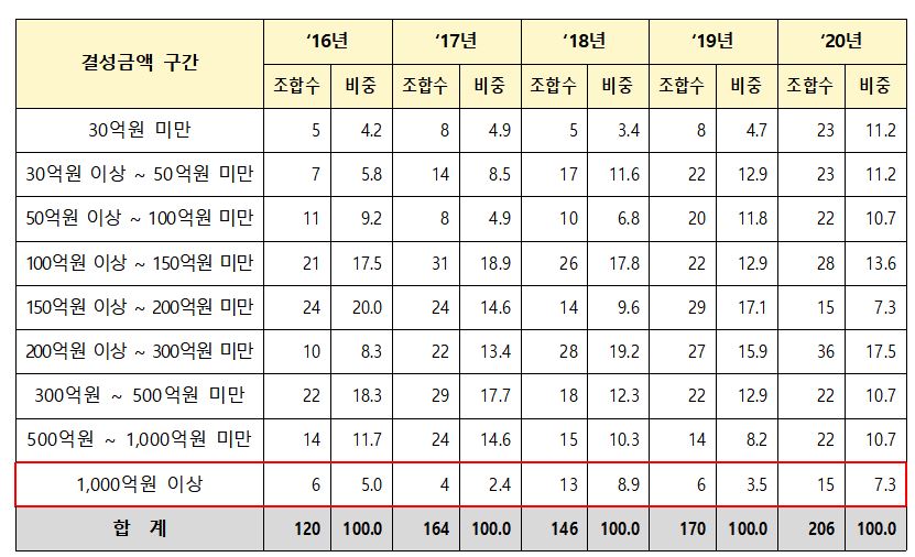결성 규모별 현황을 살펴보면, ’20년도 1,000억원 이상 결성된 펀드는 ‘19년도 6개에 비하여 크게 늘어난 15개로, 전체 206개 조합 수의 약 7.3%를 차지했다. ’18년을 제외하고 1,000억원 이상 대형펀드는 늘어나는 추세를 보였다.