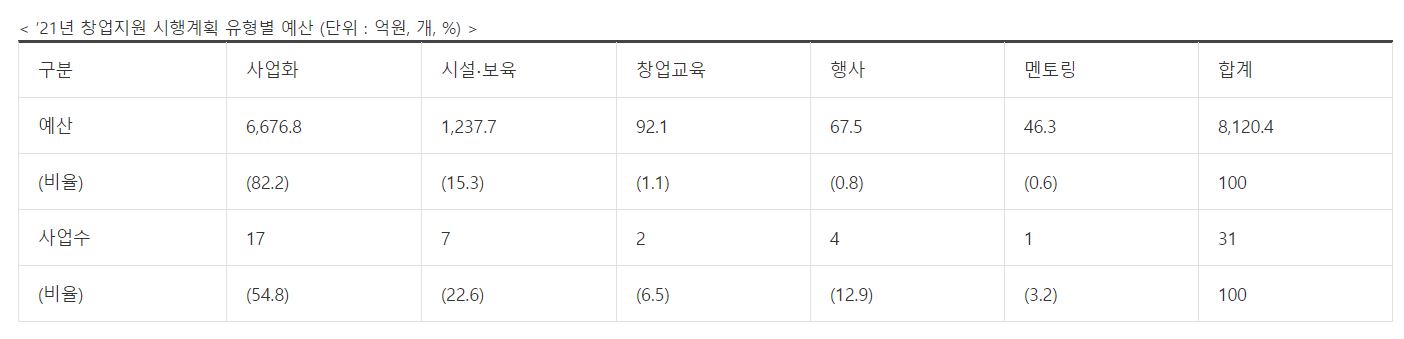 중소벤처기업부(이하 중기부)는 2021년 창업지원을 위해 사업화, 시설보육, 창업교육, 행사네트워크 등 유형별 총 31개 사업을 통해 8,120억원을 지원한다고 지난 25일 밝혔다.