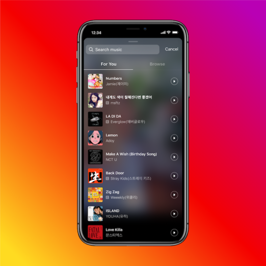 이번 서비스 출시로 ‘음악 스티커’, ‘가사 스티커’ 등 많은 국내 이용자들이 고대해 온 다양한 부가 기능을 한국에서도 사용할 수 있게 됐다. 이용자들은 음악의 대표적인 기능인 ‘음악 스티커’로 15초 분량의 스토리 영상이나 사진에 배경 음악을 추가할 수 있다. 스토리 업로드 시 추가할 수 있는 스티커 중 ‘음악 스티커’에서 원하는 음악을 선택하고 그 중에서도 원하는 구간을 선택해 사진이나 영상에 적용할 수 있다. 특정 곡이나 다양한 장르 및 분위기의 곡을 검색하거나 추천 혹은 둘러보기 탭에서 원하는 곡을 선택해 사용할 수도 있다.