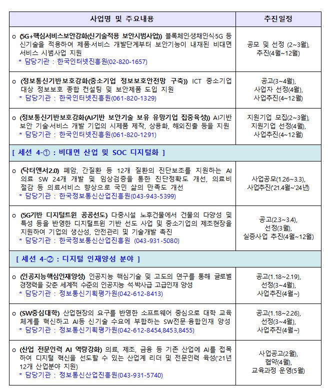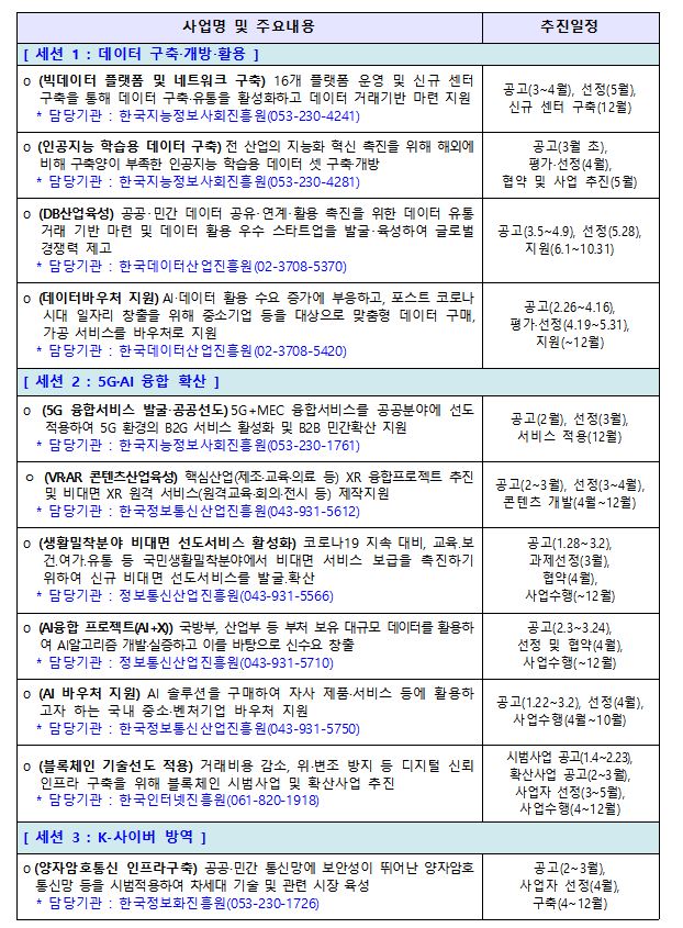 금번 사업설명회는 지난해 뉴딜 성과 공유와 함께 ’21년 디지털 뉴딜 주요사업을 4개 분야로 구분하여 ▲데이터 구축‧개방‧활용 ▲5G‧AI 융합 ▲K-사이버방역 ▲비대면 서비스‧SOC 디지털화‧디지털 인재양성 순으로 진행된다.