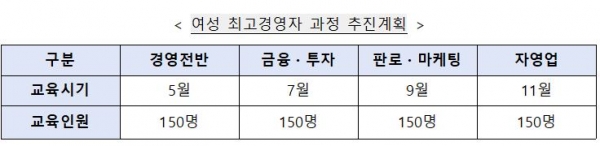 더불어 여성기업 대표의 경쟁력 강화를 위한 여성 최고경영자 과정(총 600명)을 경영, 금융, 판로, 자영업 등 분야별 온라인 과정으로 운영한다.