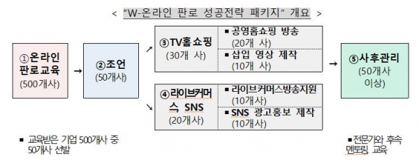 디지털 판로개척 온라인 교육을 수료한 500개사 중 유망기업 50개사 선발해 전문가 1:1 멘토링, 티브이TV홈쇼핑·라이브커머스 방송 지원, 지속적인 매출 증대를 위한 사후 교육과정을 운영한다.