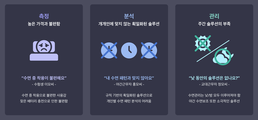 우선 기존의 수면 개선 솔루션들은 주로 ‘착용’을 해야 했다. 무언가를 착용함으로써 오히려 수면을 하는 데에 불편함을 느끼는 고객들도 많았고, 배터리 충전을 계속 신경 써야 한다는 문제도 있었다. 또한 개개인에게 맞춤형으로 제공되지 않고 획일화되거나 대략적으로 구분되어 제공되는 솔루션들은 고객 각각의 수면패턴과 맞지 않아 큰 효과가 없기도 했다. 수면 문제를 극심하게 겪는 사람들 중에는 교대 근무자나 야간 근무자가 많은데, 그들을 위한 낮 시간 동안의 수면 솔루션이 매우 부족한 실정도 문제였다.