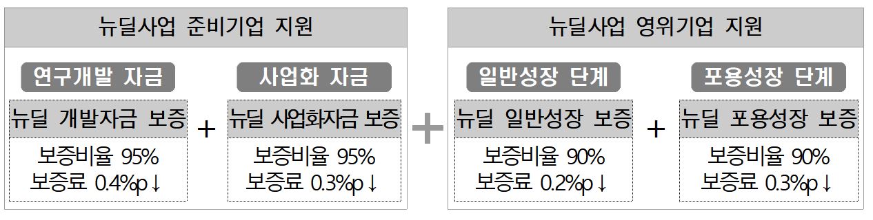 뉴딜 사업 준비 기업에 대해서는 ‘뉴딜 개발자금 보증’ 및 ‘뉴딜 사업화자금 보증’을 지원한다. 뉴딜 분야 R&D 및 사업화 등에 소요되는 자금을 최대 10억 원까지 보증지원하고, 보증비율(최대 95%)과 보증료(최대 0.4%p 차감)를 우대 적용한다.