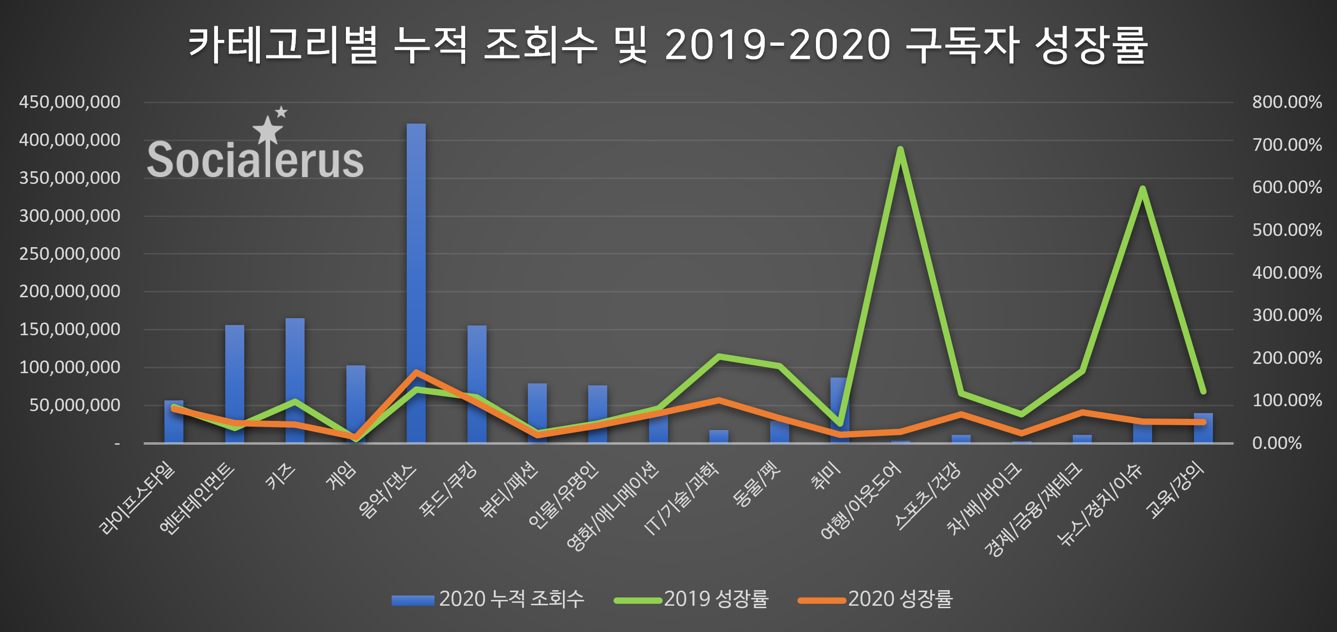 카테고리별 성장률을 살펴보면 ‘음악/댄스’ 분야 채널들은 전세계적인 K-Pop 인기의 영향으로 구독자 150%, 조회수 200% 가까이 성장이라는 놀라운 결과를 기록했고 ‘IT/기술/과학’ 분야 채널들도 100% 성장하며 유튜브의 컨텐츠의 전문화를 이끌었다. 2020년은 코로나로 실내 생활이 많아진 덕에 전반적으로는 성장했으나, 코로나의 직격탄을 받은 ‘여행/아웃도어’ 분야 채널은 2019년 구독자 성장률 690%에서 2020년에는 26%로 크게 주저 앉아 힘든 한 해가 되었다. 한편, 2019년 구독자가 592%나 폭발적으로 증가했던 ‘뉴스/정치’ 분야 채널들은 가짜 뉴스로 진통을 겪으며 구독자 성장률이 51%로 주저 앉았다.