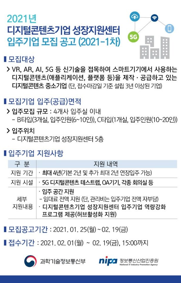 과학기술정보통신부와 정보통신산업진흥원에서 주관하고 차세대융합콘텐츠산업협회이 운영하는 디지털콘텐츠기업 성장지원센터(안양 평촌 소재, 이하 DC성장지원센터)가 19일까지 2021년도 1차 신규 입주기업을 모집한다고 지난 1일 밝혔다.