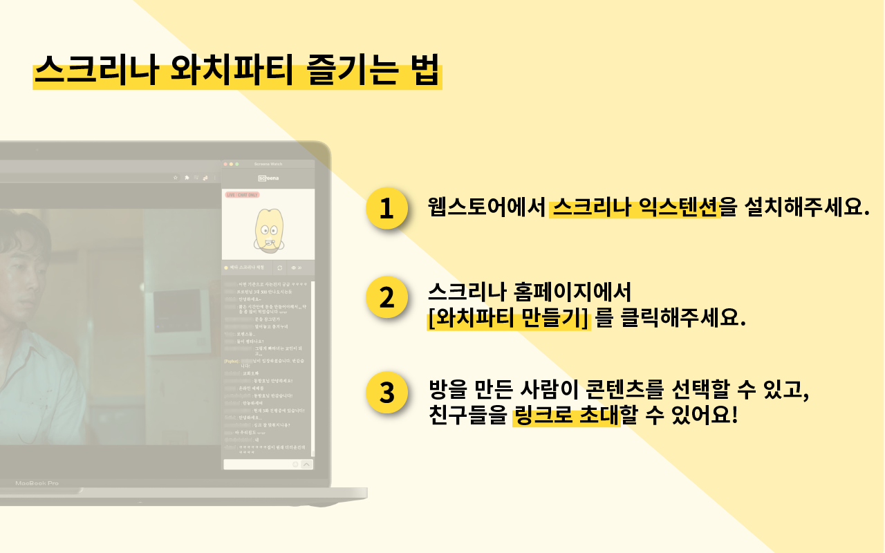 스크리나는 OTT(동영상 스트리밍 서비스)를 통해 물리적으로 떨어져 있는 사람들이 동시간대에 접속해 콘텐츠를 보는 와치 파티(Watch Party)솔루션인 ‘스크리나 와치’를 개발해 운영하고 있다. 스크리나 와치는 넷플릭스, 웨이브 등의 OTT 서비스와 유튜브, 비메오와 같은 영상 플랫폼을 연동해 실시간으로 영상 콘텐츠를 보며 채팅, 화상으로 교류할 수 있는 서비스다. 사용자는 직접 방장이 되어 영화를 선택하고 원하는 사람들을 초대하는 등 와치 파티를 주최할 수 있고, 크리에이터가 개설한 공간에서 불특정 다수의 사람들과 보고 싶은 영상 콘텐츠를 함께 즐길 수 있는 ‘크루파티’도 참여할 수 있다.