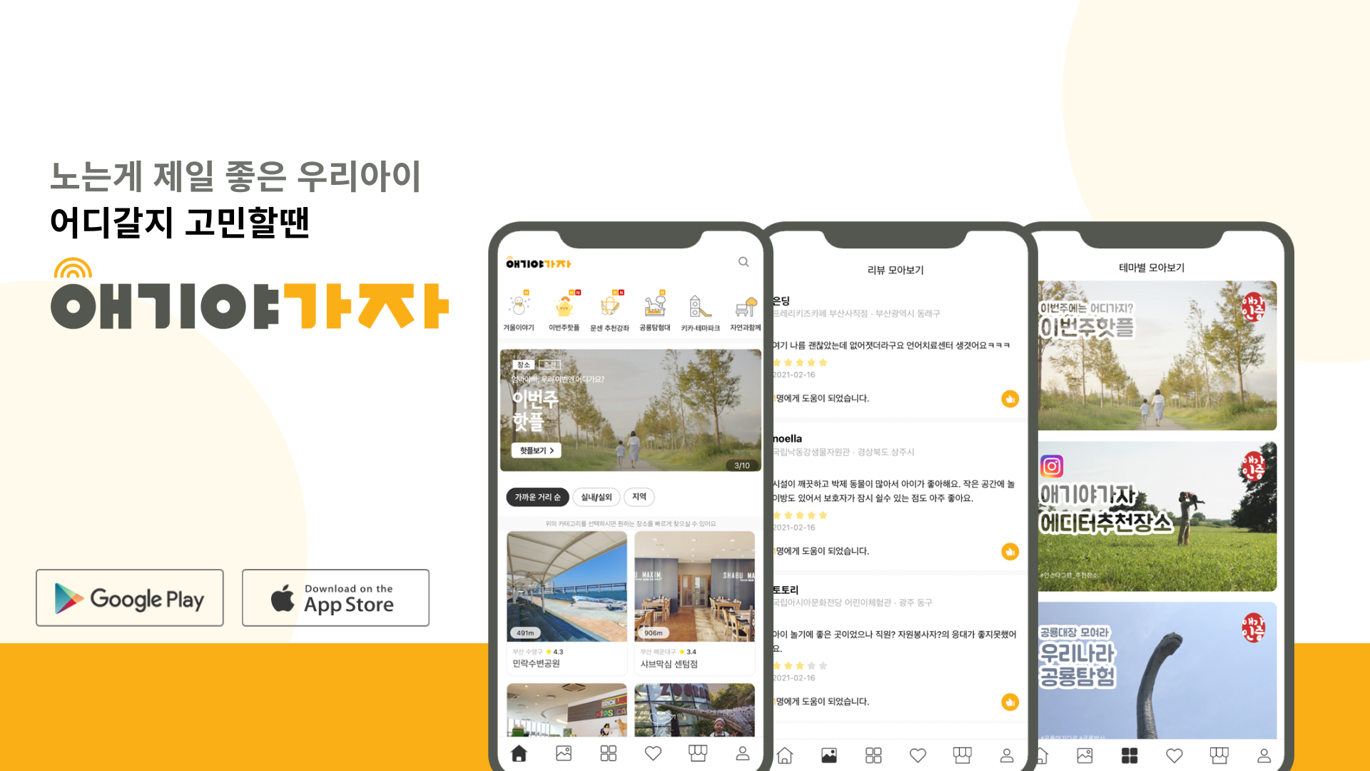 이용 고객들은 아이와 함께 갈 만한 곳의 정보 약 1만5천여 개를 위치 기반 그리고 카테고리 기반으로 쉽게 확인할 수 있으며, 장소에 대한 후기와 댓글리뷰를 실시간으로 확인 할 수 있다.