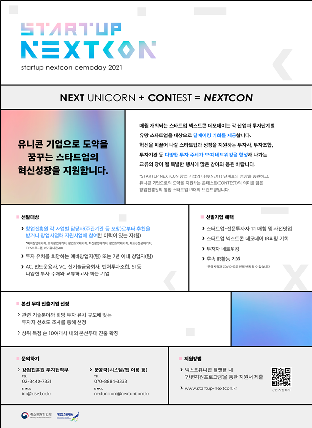창업진흥원 (원장 김광현, 이하 창진원)의 통합 스타트업 투자유치 대회인 ‘스타트업 넥스트콘 (START-UP NEXTCON)’을 오는 24일 개최한다고 밝혔다.