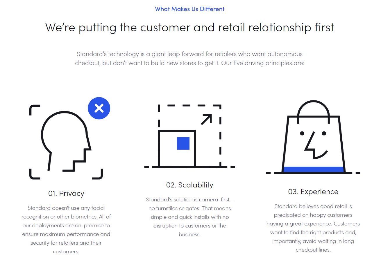 스탠다드는 유통 업체를 계산대 없는 매장으로 빠르게 전환시키는 컴퓨터 비전 플랫폼 선도 기업이다. 인공지능 기반의 컴퓨터 비전 솔루션을 통해 사람들은 줄을 서거나 스캔하거나, 계산을 위해 멈춰 서지 않고도 쇼핑을 할 수 있다. 스탠다드 시스템은 천장에 장착된 카메라로 주로 고객이 어떤 물건을 집는지 감지할 수 있으며, 안면 인식 기능을 사용하지 않아 고객은 익명성을 유지할 수 있다. 또한 기존 일반 매장의 구조, 선반, 조명, 재고 관리 프로세스를 변경하지 않고도 손쉽게 솔루션을 설치할 수 있다.