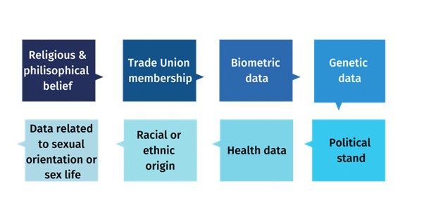 GDPR은 특정 유형의 개인 데이터를 특정 보호를 받을 수 있는 개인 데이터의 ‘특수 범주’로 식별한다. 이러한 범주의 특성은 개인의 기본 권리와 자유에 중대한 위험을 초래할 수 있음을 의미한다. 이들은 ‘인종 또는 민족적 출신, 정치적 견해, 종교적 또는 철학적 신념, 노동조합 가입 및 유전자 정보 처리, 자연인을 고유하게 식별하기 위한 생체 인식 데이터, 자연인의 성생활 또는 성적 취향’이다.