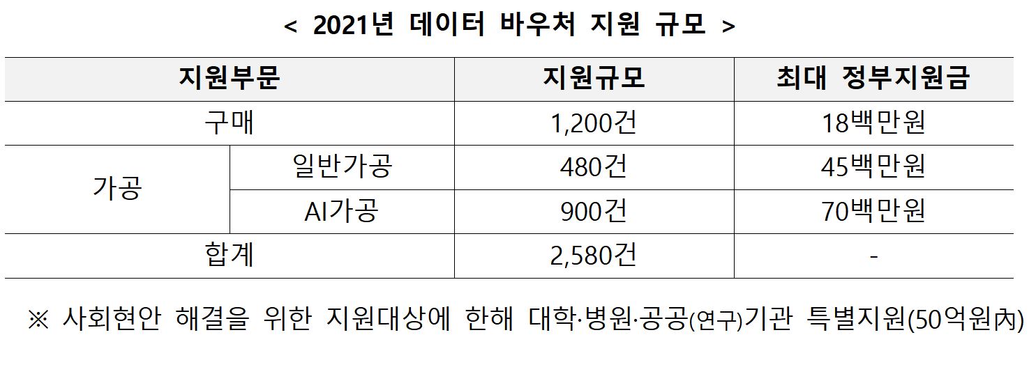 2019년부터 추진해 온 데이터 바우처 지원 사업은 중소기업·소상공인 등이 데이터를 활용하여 비즈니스 혁신 및 新제품‧서비스 개발시 필요한 데이터상품 또는 가공서비스 비용을 지원하는 사업으로, 올해 총 2,580개의 바우처(총 예산 1,230억원)를 지원한다.