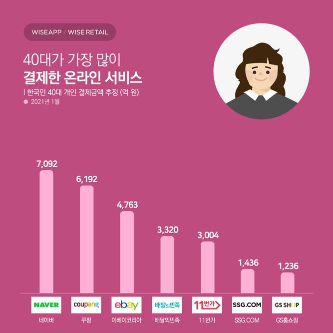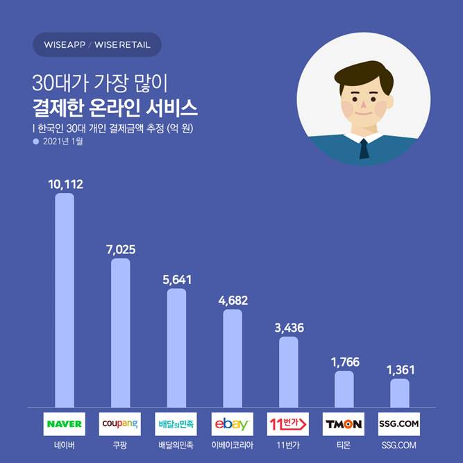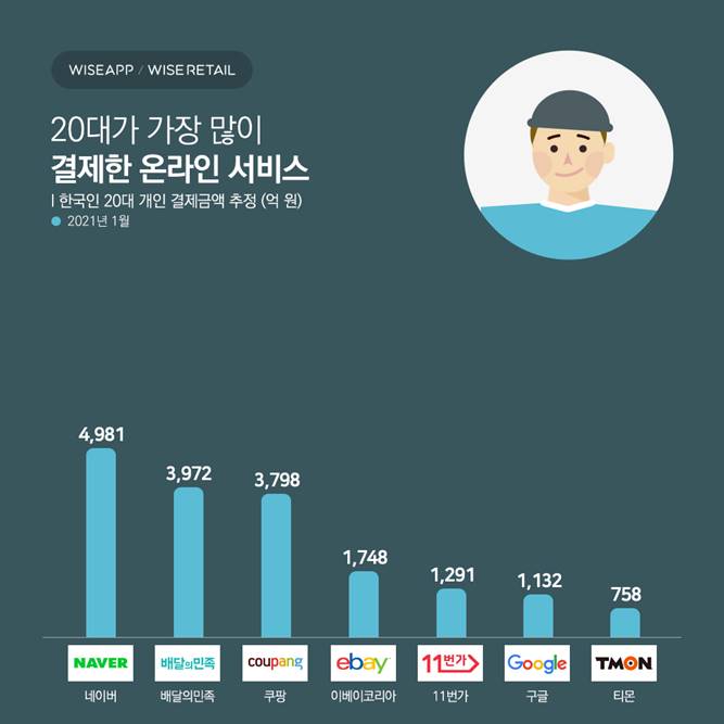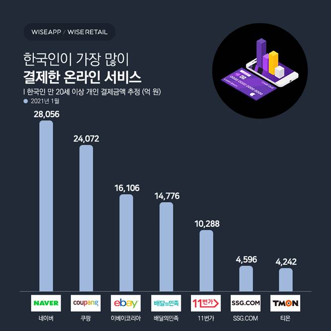 한국인 만 20세 이상 소비자의 신용카드, 체크카드, 계좌이체 등 결제금액을 표본 조사한 결과, 지난 1월에 모든 연령대를 합쳐 한국인이 가장 많은 금액을 결제한 온라인 서비스는 네이버, 쿠팡, 이베이코리아, 배달의민족, 11번가, SSG.COM, 티몬 순으로 추정됐다.