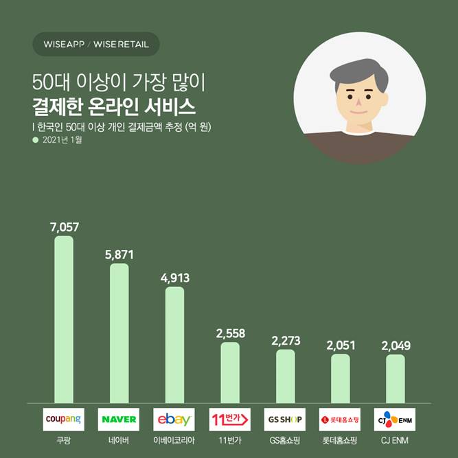 50대 이상은 쿠팡, 네이버, 이베이코리아, 11번가, GS홈쇼핑, 롯데홈쇼핑, CJ ENM 순이었다.