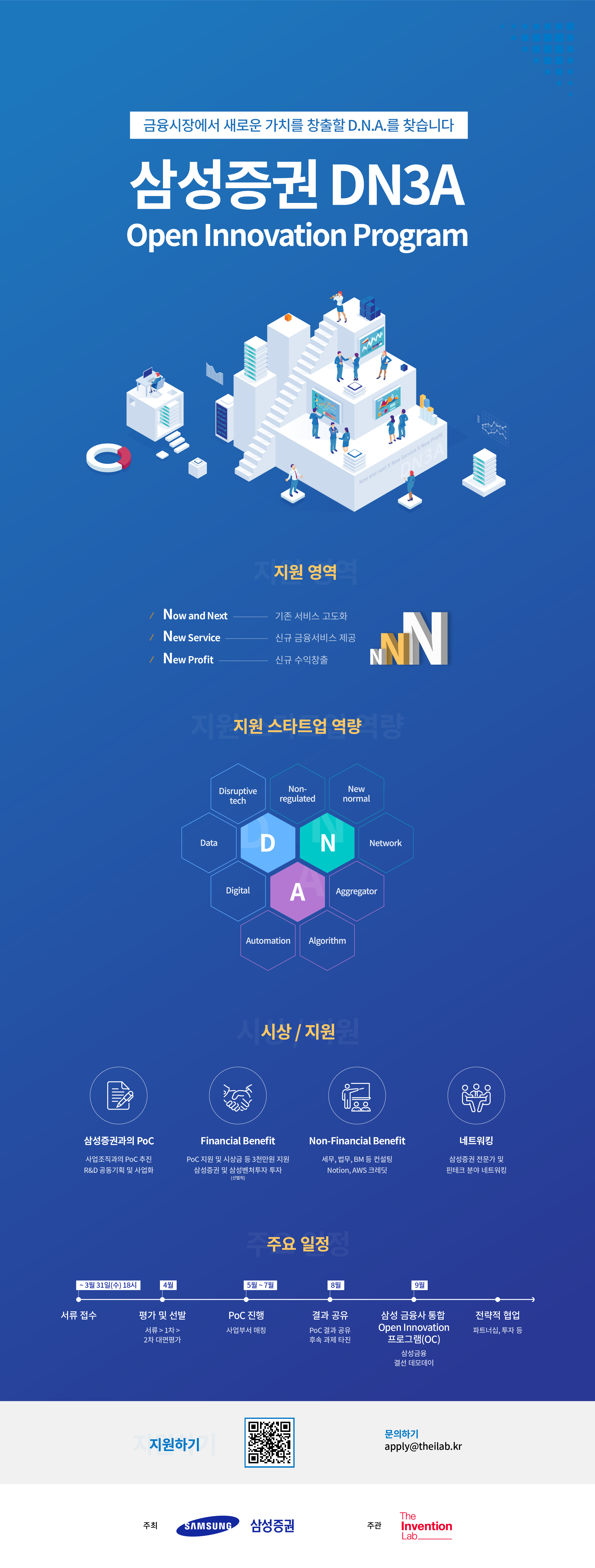 삼성증권 DN3A는 증권업 선도기업인 삼성증권이 금융, 핀테크 뿐만 아니라 라이프스타일 전반의 스타트업과 함께 PoC (Proof of Concept, 사업 개념 증명)를 거쳐 투자 및 공동사업화로 이어지는 오픈 이노베이션 프로그램이다.