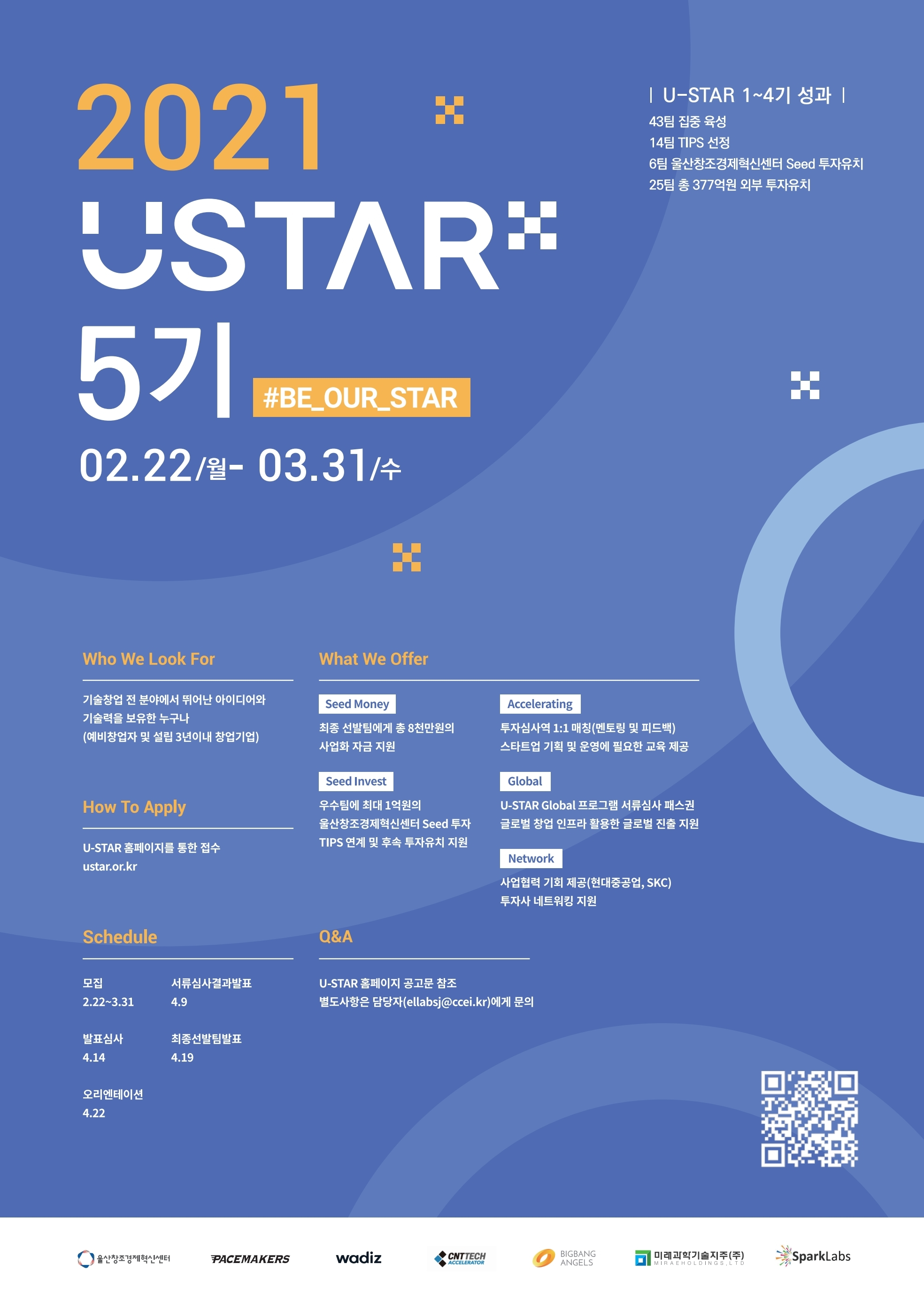 U-STAR 5기는 3월 31일(수)까지 모집하며, 모집 관련 자세한 내용은 울산센터 홈페이지(https://ccei.creativekorea.or.kr/ulsan/) 혹은 U-STAR 홈페이지(https://ustar.or.kr/)를 통해 확인가능하다.