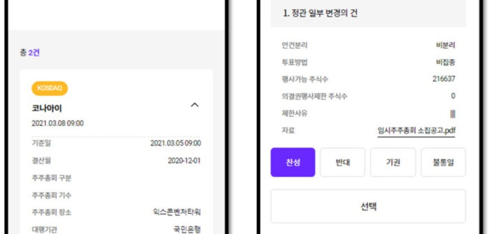 핀테크 기업 코나아이가 자체 블록체인 플랫폼 기반 '주주투표 서비스'를 출시한다고 밝혔다. 코나아이는 지난 1월 하이퍼레저 패브릭 기반 기업용 블록체인 플랫폼 '코나체인(KonaChain)'을 출시하고 투표서비스, 여론·설문조사 등의 서비스를 제공하고 있다. 사측에 따르면 모바일 웹브라우저 기반의 코나체인 플랫폼 투표 서비스는 분산형 애플리케이션으로 데이터의 위변조가 불가능하고 익명성이 보장되어 투명하고 신뢰할 수 있는 결과를 제공한다. 특히 참여자에게 쿠폰 등의 보상을 지급할 수 있고, 기존 지역화폐 플랫폼에 부가서비스로 확장이 가능해 다양한 여론조사를 진행하는 지자체에서 의사소통 수단으로 활용할 수 있다. 이번에 출시한 주주투표 서비스는 블록체인 기반의 투표를 통해 모든 결과를 투명하게 공개할 수 있어 주주와의 소통을 강화할 수 있고, 주주총회 참석 편의성도 제고할 수 있다. 기업 입장에서는 간편한 참여를 통한 높은 투표 참여율로 주주들의 의견을 최대한 청취할 수 있고, 주주 입장에서는 위변조가 불가능한 신뢰성 높은 플랫폼을 통해 기업의 경영에 참여하는 의견을 낼 수 있는 장점이 있다는 것이 사측의 설명이다. 코나아이 조정일 대표는 "코나체인을 이용하면 쉽고 빠르게 블록체인 기반 서비스를 구축하고 이용할 수 있어 지자체 및 기업에서 문의가 많은 상황이다. 오는 15일에는 대전시 대덕구 지역화폐 플랫폼 '대덕e로움'에 코나체인 서비스가 연계될 예정"이라고 전했다. 한편, 코나아이는 3월 19일 열릴 예정인 제 23기 주주총회에 앞서 9일부터 18일까지 코나체인 플랫폼에서 주주투표를 진행한다. 주주는 코나체인(https://konachain.co.kr) 주주총회 페이지를 통해 의결권을 행사할 수 있다.