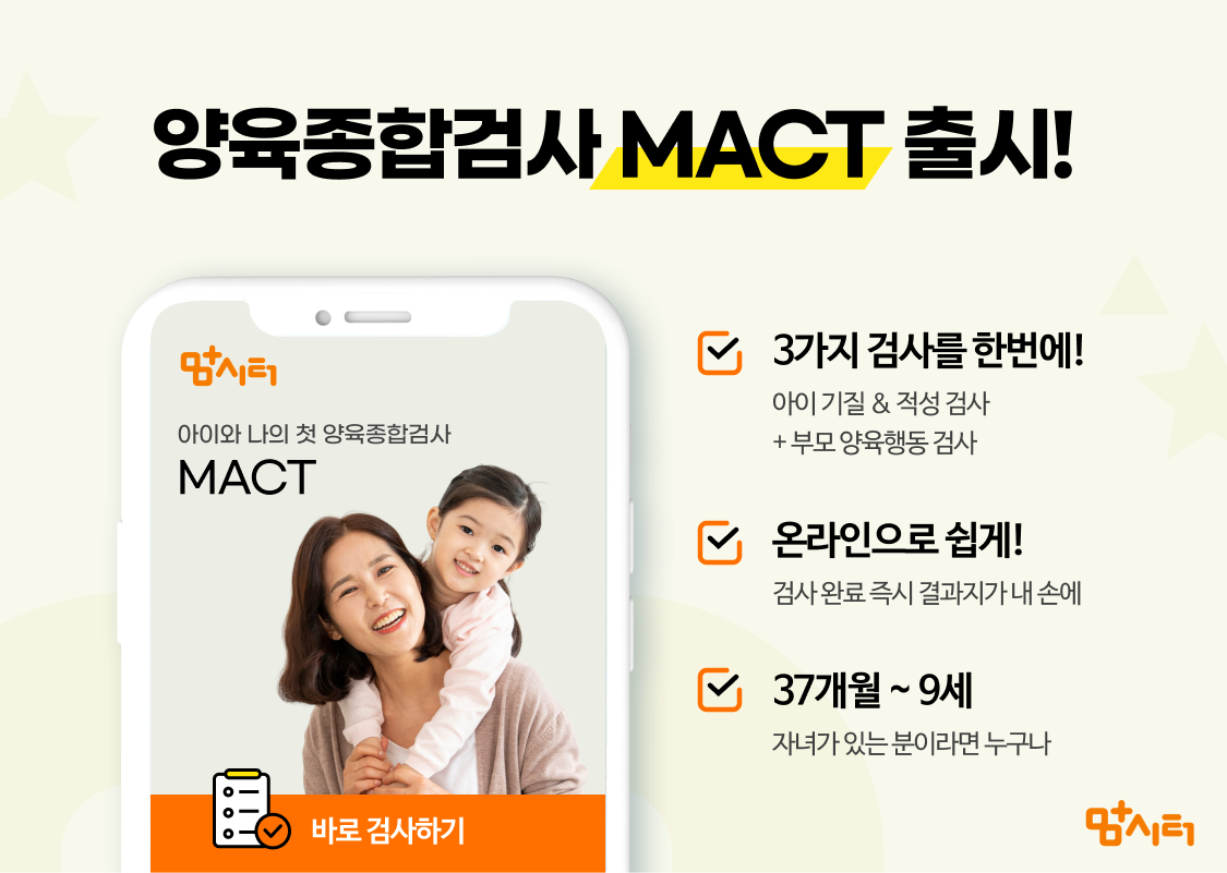 MACT는 전문 검사기관에서 진행하는 ‘관찰자 보고식 선별검사’를 온라인으로 적용한 검사로 아이의 기질과 적성, 부모양육행동을 부모가 직접 체크하면 아이와 양육자에 대한 분석과 이에 맞는 맞춤형 양육법을 제안한다.