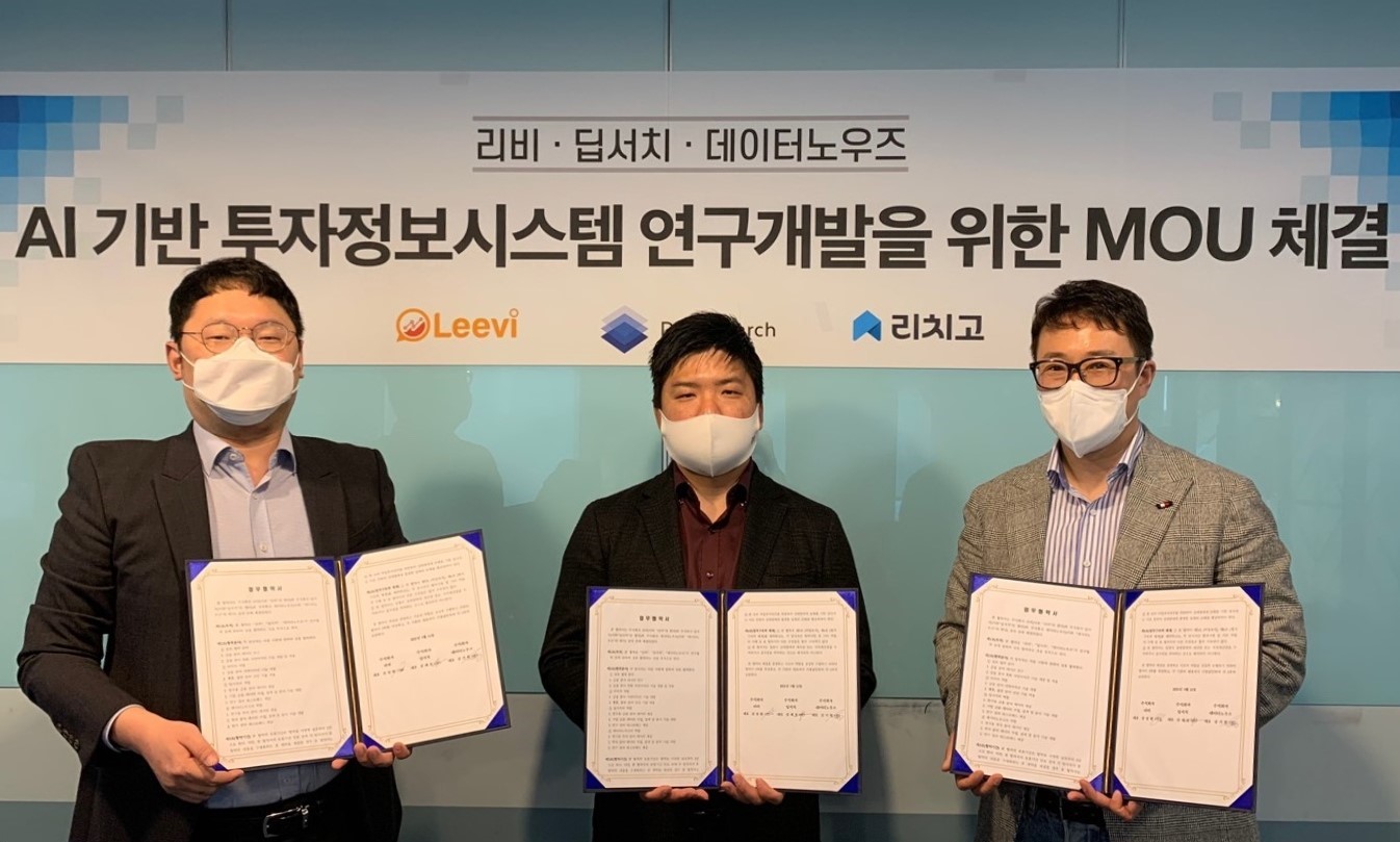 자연어처리 및 챗봇 전문 기업 리비는 금융데이터 분석 전문 기업 딥서치, 투자데이터 분석 전문 기업 데이터노우즈와 인공지능 기반 투자정보시스템 연구 개발을 위한 업무협약(MOU)을 체결했다고 밝혔다.