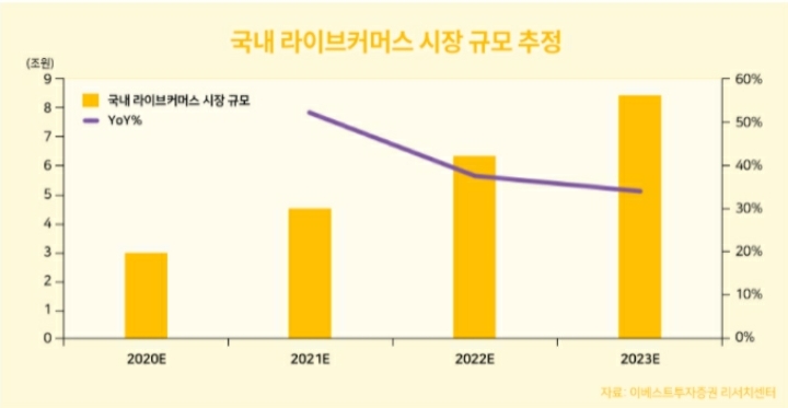 한국 라이브커머스 시장은 2017년 라이브커머스가 처음 도입되었고(티몬이 “티비온(TVON)”으로 처음 시작), 2020년의 시장규모는 약 3조로 추정(한국 전체 전자상거래 대비 1.9%)되며 2023년에는 8조원(전체 전자상거래 대비 3.5%)까지 고성장이 예상되고 있습니다.