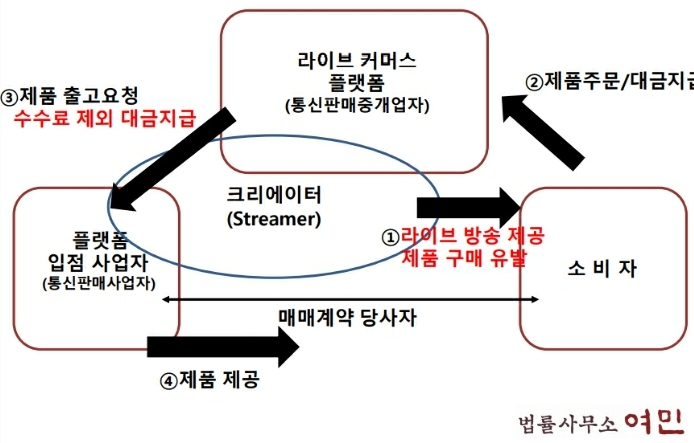 라이브커머스는 “양면시장”이라는 특성을 가지고 플랫폼 입점사업자(주로 전자상거래법 상 “통신판매업자”)가 공급측이면 소비자가 수요측이며 라이브커머스 플랫폼(주로 전자상거래법 상 “통신판매중개업자”)이 중개하며, 구체적으로는 플랫폼에서 크리에이터(또는 Streamer)가 상품을 소개하며 소비자의 구매를 더욱 촉진시킵니다.