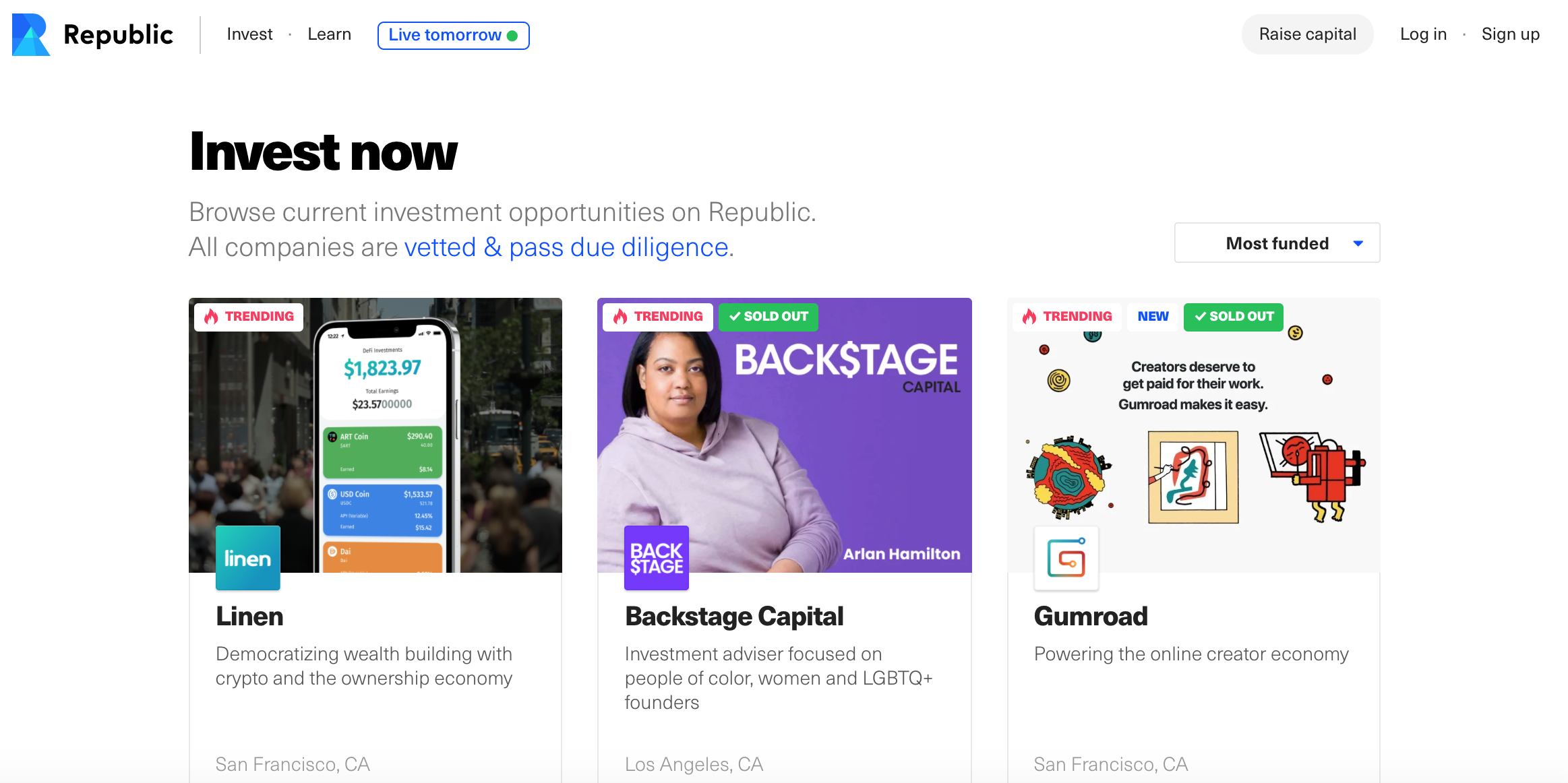 리퍼블릭은 미국 제도권 내에서 스타트업(비상장 주식)과 디지털 자산 투자가 가능한 유일한 투자 플랫폼이라는 것이 사측의 설명이다. 특히 리퍼블릭은 기관이나 고액자산가 뿐만이 아닌 일반 개인을 고객 대상으로하는 투자 서비스로서 그 입지를 점차 넓혀가고 있다.