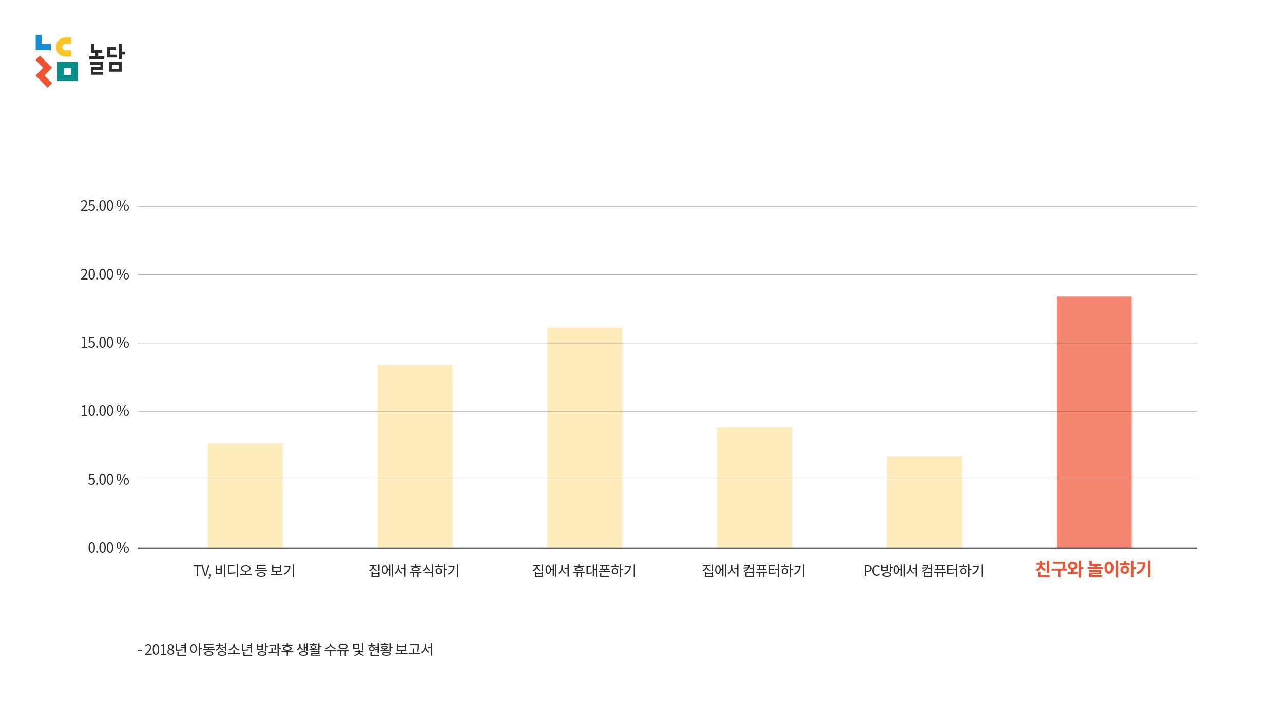 2018년에 실시된 아동청소년 방과후 생활 수요 및 현황 보고서 (한국청소년활동진흥원)에 따르면 아동 청소년이 방과후에 가장 하고 싶은 활동 1위는 친구들과 놀이하기이다. 한편 실제로 방과후에 친구들과 놀이를 하고 있다는 응답은 희망한다는 응답에 비해 19% 낮았다. 2013년 조사에 비해, 학원이나 과외, 집에서 숙제하기는 희망하는 것보다 실제로 하고 있다는 응답률이 높아진 반면, 친구하고 놀기는 희망하는 것보다 실제로 하고 있다는 응답이 감소하여 아동의 놀권리가 과거보다 보장받지 못하고 있는 것으로 분석된다. 우리나라 아동들의 행복 수준은 OECD 국가 중 행복도의 평균이 가장 낮은 수준이다.