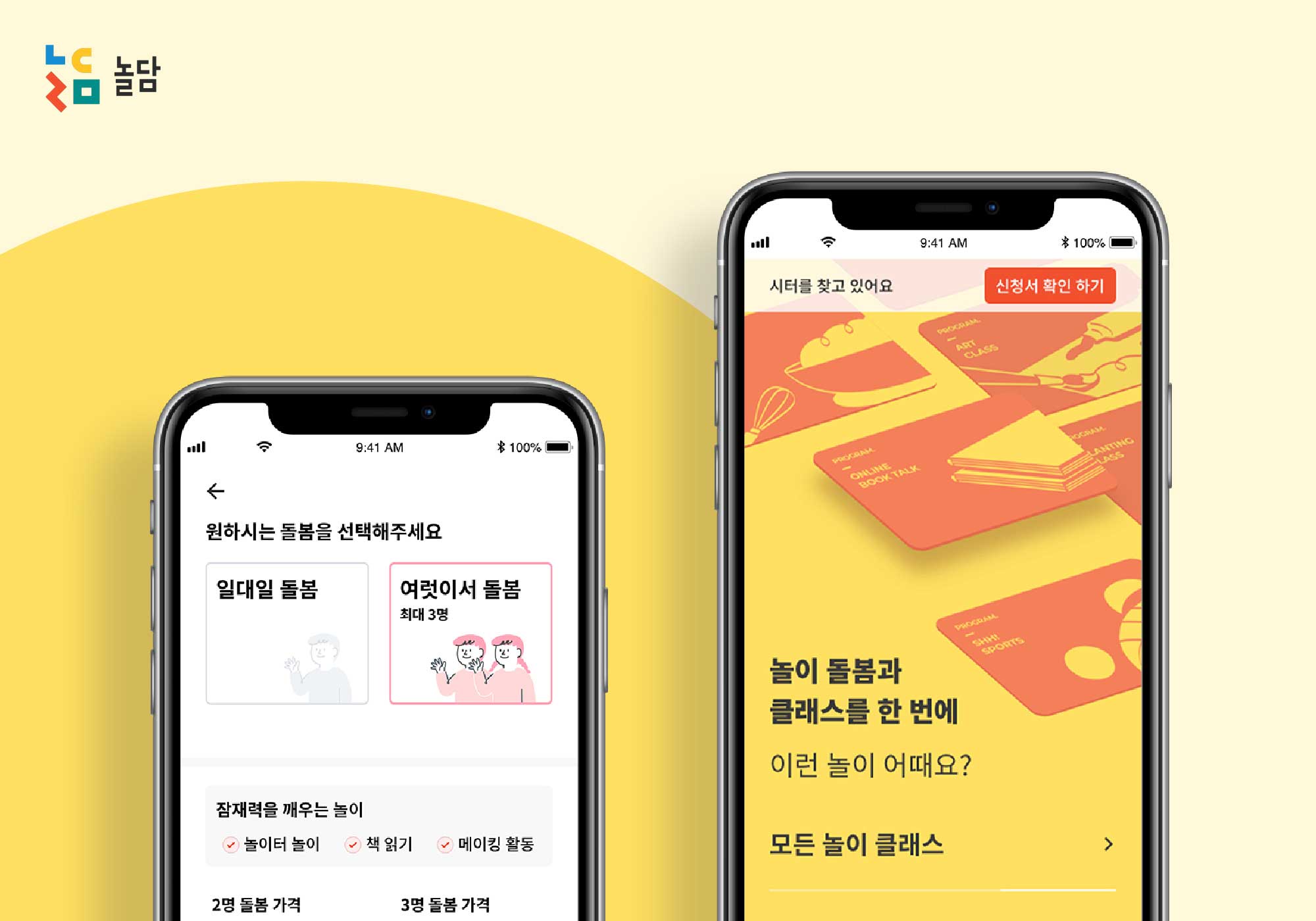 ‘놀담’은 돌봄이 필요한 가정에게 인증된 시터를 매칭해주는 아이 돌봄 어플리케이션이다. 사측에 따르면 놀담 회원 수는 12만명을 육박하며 저출생과 여성의 경력단절을 야기하는 심각한 사회문제인 돌봄 공백의 문제에 대한 대안으로 일하는 양육자에게 만족도가 매우 높은 서비스이다.