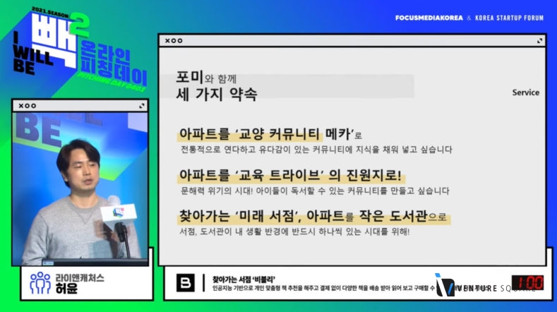 포커스미디어코리아(대표이사 윤제현)와 코리아스타트업포럼(의장 김슬아, 안성우, 이승건)이 공동 추진한 스타트업 맞춤형 광고 마케팅 지원프로그램 ‘l WILL BE 빽 2021(이하 아윌비빽2021)’의 온라인 피칭데이가 4월 1일 개최 되었다. 이번 행사는 유튜브 라이브를 통해 실시간으로 중계 됐고, 시청자 300여 명이 참여한 가운데 성황리에 종료되었다.