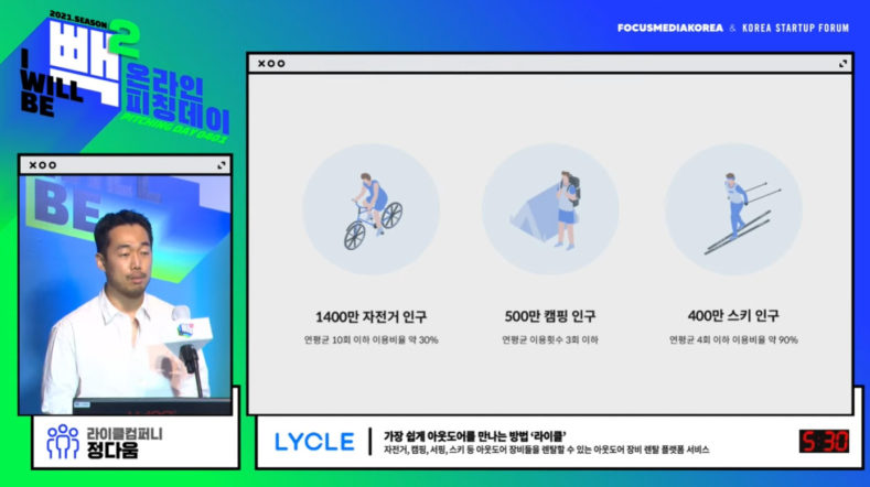 라이클컴퍼니(라이클) 정다움 대표는 먼지 쌓인 자전거들의 사진을 보여주며 발표를 시작했다. 한달에 1번만 자전거를 타는 인구가 300만 명을 넘는 등 비싼 아웃도어 장비 구매를 구비하고도 막상 활용도 낮은 현실을 소개하고, 자전거, 캠핑, 서핑, 스키 등 아웃도어 장비들을 렌탈할 수 있는 라이클 서비스의 장점을 알렸다.
