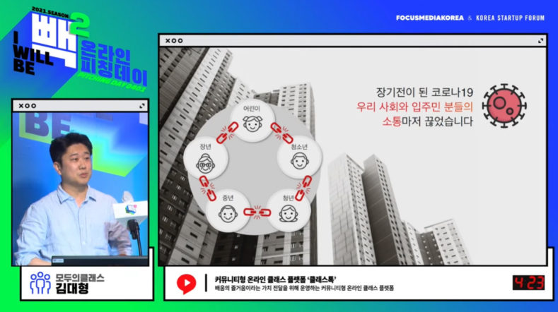 모두의클래스(클래스톡) 김대형 대표는 기존 온라인 교육 서비스들이 언제 어디서나 쉽게 이용가능한 만큼 이탈이 쉽고 단방향 소통이라 완강율이 10% 이하라고 문제점을 지적하고, 클래스톡은 단방향이 아닌 소통으로 이런 문제를 풀어 내고 있다고 소개했다. 특히, 코로나 상황에서 세대간, 이웃간 단절, 커뮤니티 센터 폐쇄 등 단절을 넘어 고립의 상황에 이르게 된 현재, 수강생과 코치간, 수강생과 수강생간 경험을 공유하고 소속되어 나누는 커뮤니티형 온라인 강의 플랫폼인 클래스톡이 좋은 반응을 얻고 있다고 설명했다.