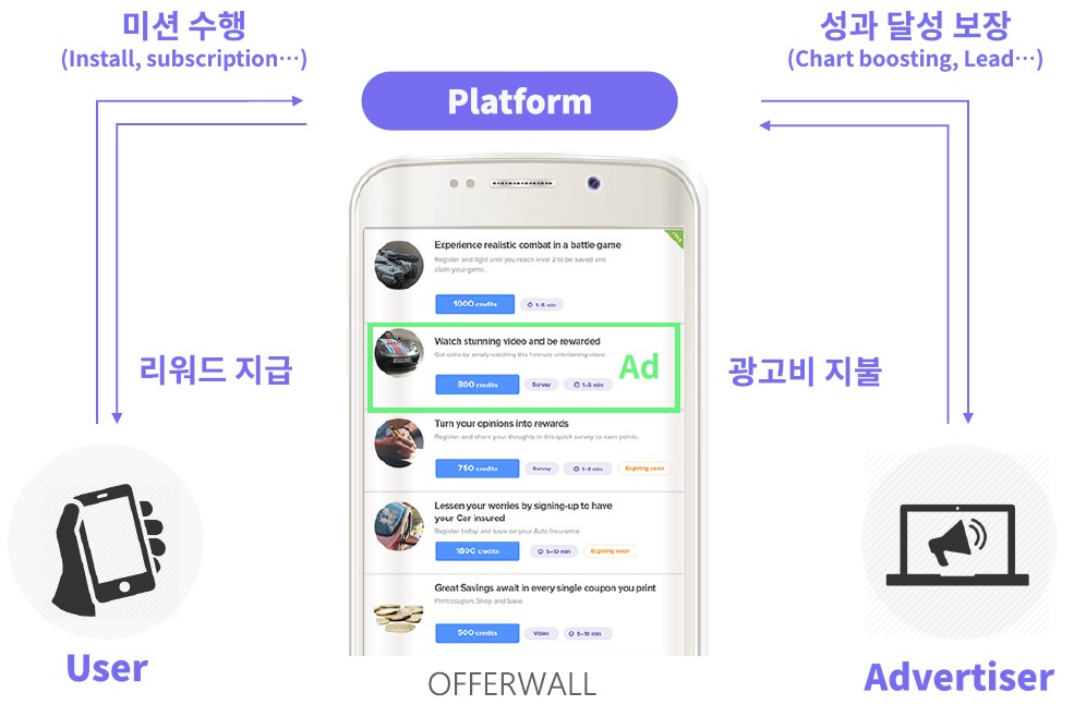 엔스테이션이 제공하는 리워드(Reward) 오퍼월(Offerwall) 광고 플랫폼은 광고주가 진행하는 이벤트 등 특정 미션을 유저가 수행하면 유저에게 포인트 등 보상을 해주는 형태의 광고 서비스다.