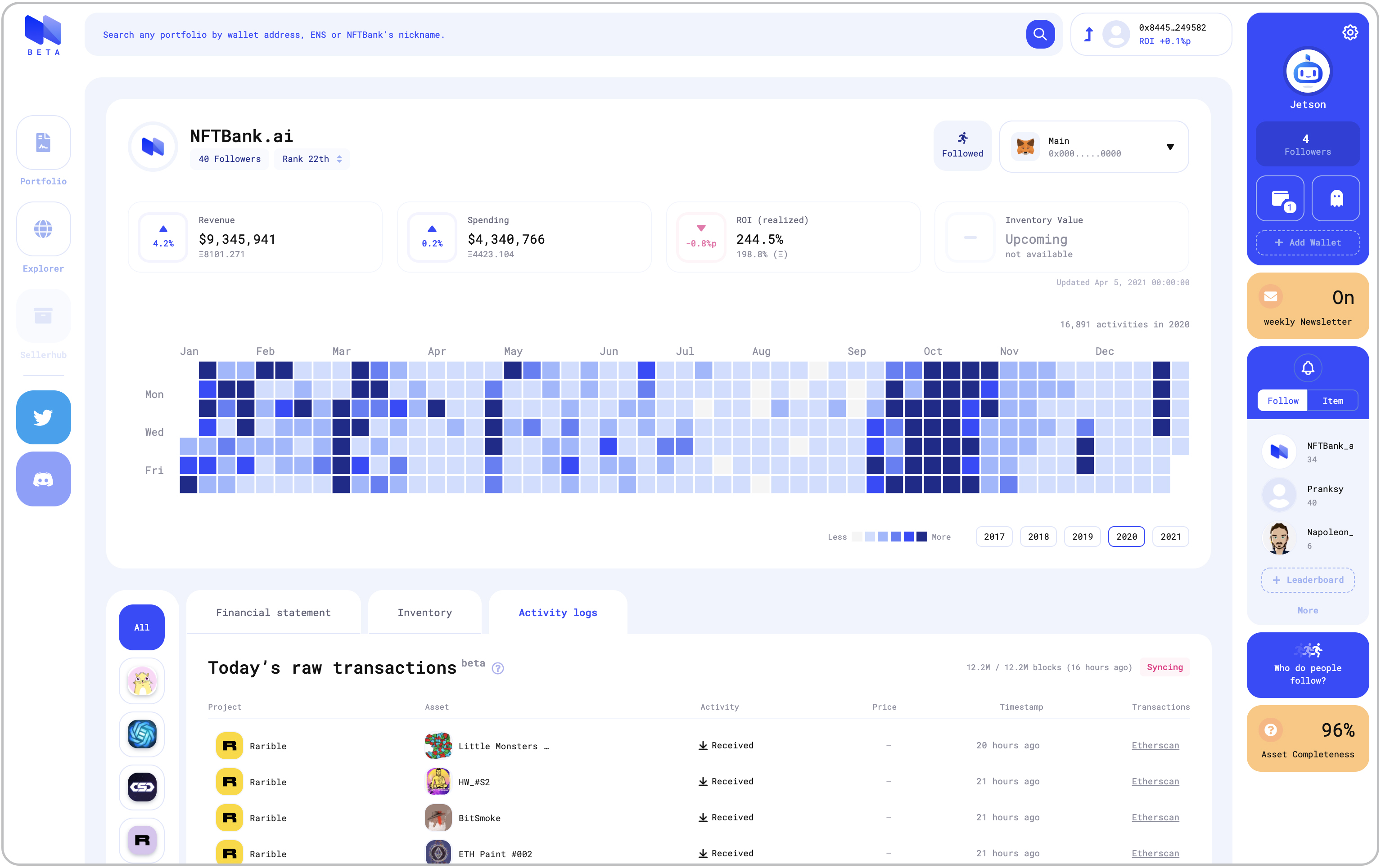 NFT 뱅크는 더 샌드박스(The Sandbox), 엑시 인피니티(Axie Infinity), 리그 오브 킹덤(League Of Kingdom) 등 여러 블록체인 게임의 NFT 자산을 한번에 관리할 수 있는 통합 서비스를 제공하고 있다. 현재 이더리움, 폴리곤(전 매틱: Matic) 네트워크 상에 존재하는 NFT를 지원한다. 사용자들은 NFT 뱅크를 통해 흩어져 있는 모든 NFT 자산을 한 번에 모아 관리할 수 있다. 또한 가까운 시일에 클레이튼(Klaytn), 플로우(Flow), 이뮤터블엑스(ImmutableX) 네트워크가 통합되며 실시간 NFT 시세와 NFT를 기반으로 한 다양한 금융 상품도 제공받을 수 있을 예정이다.