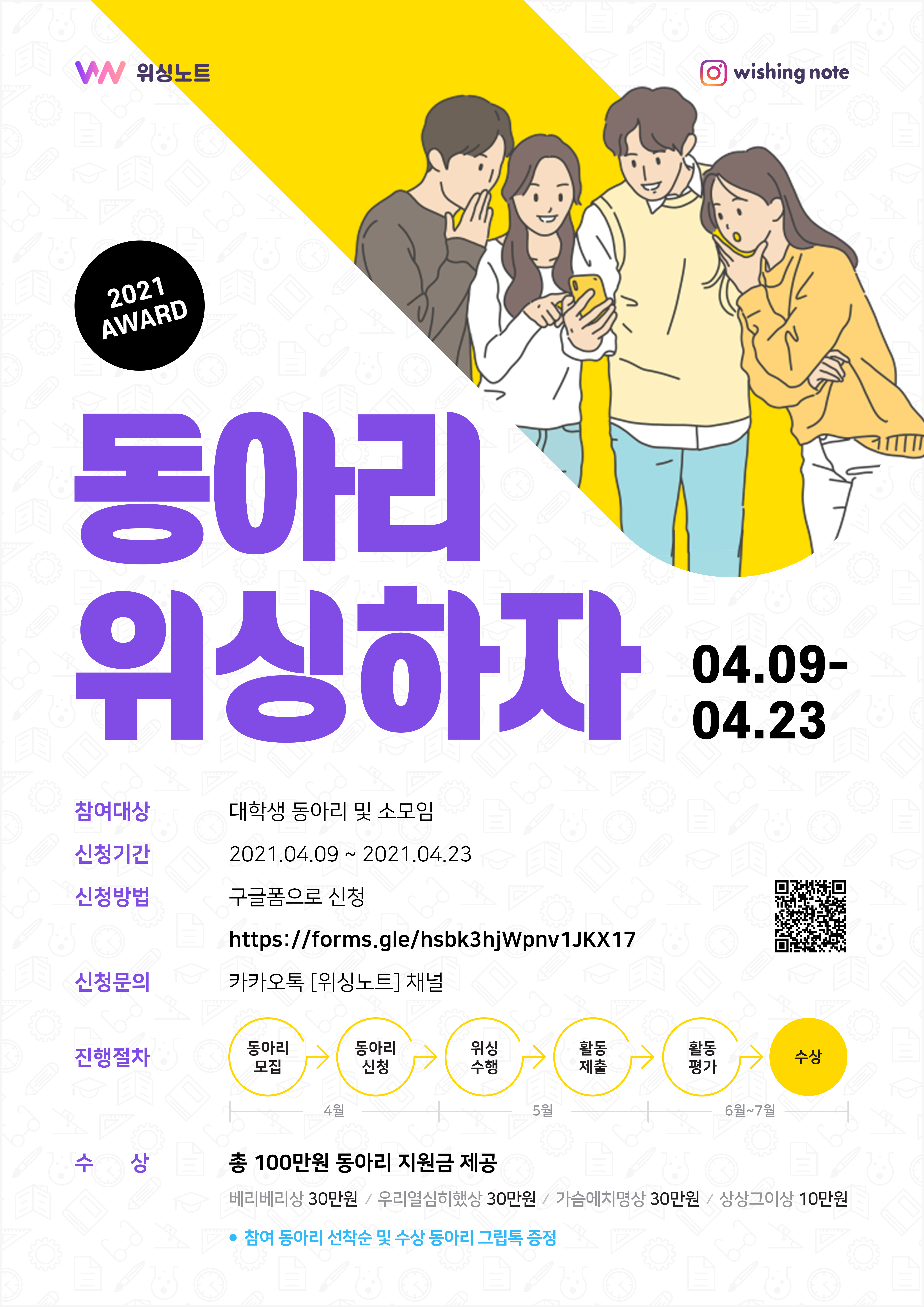 수상 선정된 우수 활동팀에 지원금(총 100만원)을 제공한다. 또한, 수상 전원에게 위싱노트 그립톡을 증정한다. 공모전에 참여는 위싱노트 홈페이지 이벤트 페이지를 통해 할 수 있다. *문의 : contact@nbliss.com