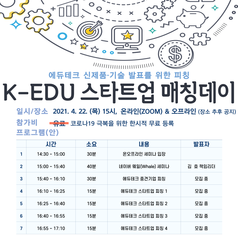 한국에듀테크산업협회에서 주최하는 ‘K-EDU 스타트업 매칭데이’가 오는 4월 22일 목요일 15시에 진행된다. 온라인 웨비나로 진행되는 이번 행사는 에듀테크 신제품과 기술 발표를 위한 자리를 제공한다. 본격적인 스타트업 매칭데이에 앞서 김효 네이버 웨일 책임리더가 네이버 웨일 세미나를 진행할 예정이다. 에듀테크 중견 기업의 피칭과 에듀테크 스타트업 4곳의 피칭이 예정되어 있으며 발표자는 모집하고 있다. K-EDU에 관심이 있는 기술자, 기획자 등 누구나 세미나에 참여할 수 있다. 웨비나에 대한 자세한 내용 확인과 참가 신청은 이곳에서 할 수 있다.