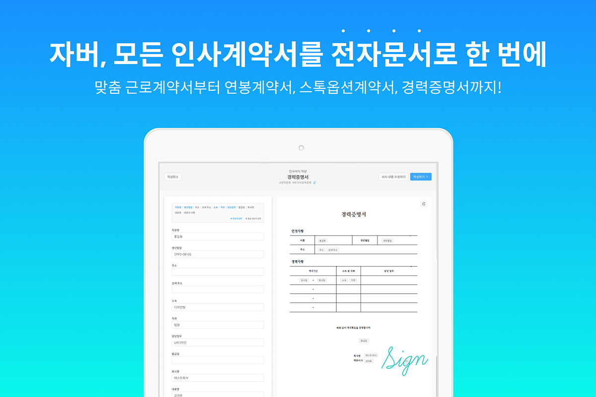 삼성전자 IT 솔루션 사업부 출신 이동욱 대표가 2017년에 설립한 자버는 정규직, 프리랜서, 일용직 파트타이머 등 다양한 직군의 전자인사 계약서를 작성하고 근로자로부터 전자서명을 받을 수 있는 전자계약 기반 인사관리 서비스다. 계약 시 입력된 근로자의 신상 정보를 바탕으로 각종 인사관리 증명서와 동의서, 인사서식 등을 간편하게 발급받을 수 있다. 사업 초기에 성장 가능성을 인정받아 2017년 프라이머 배치팀에 선정되어 시드 투자를 받기도 했다.
