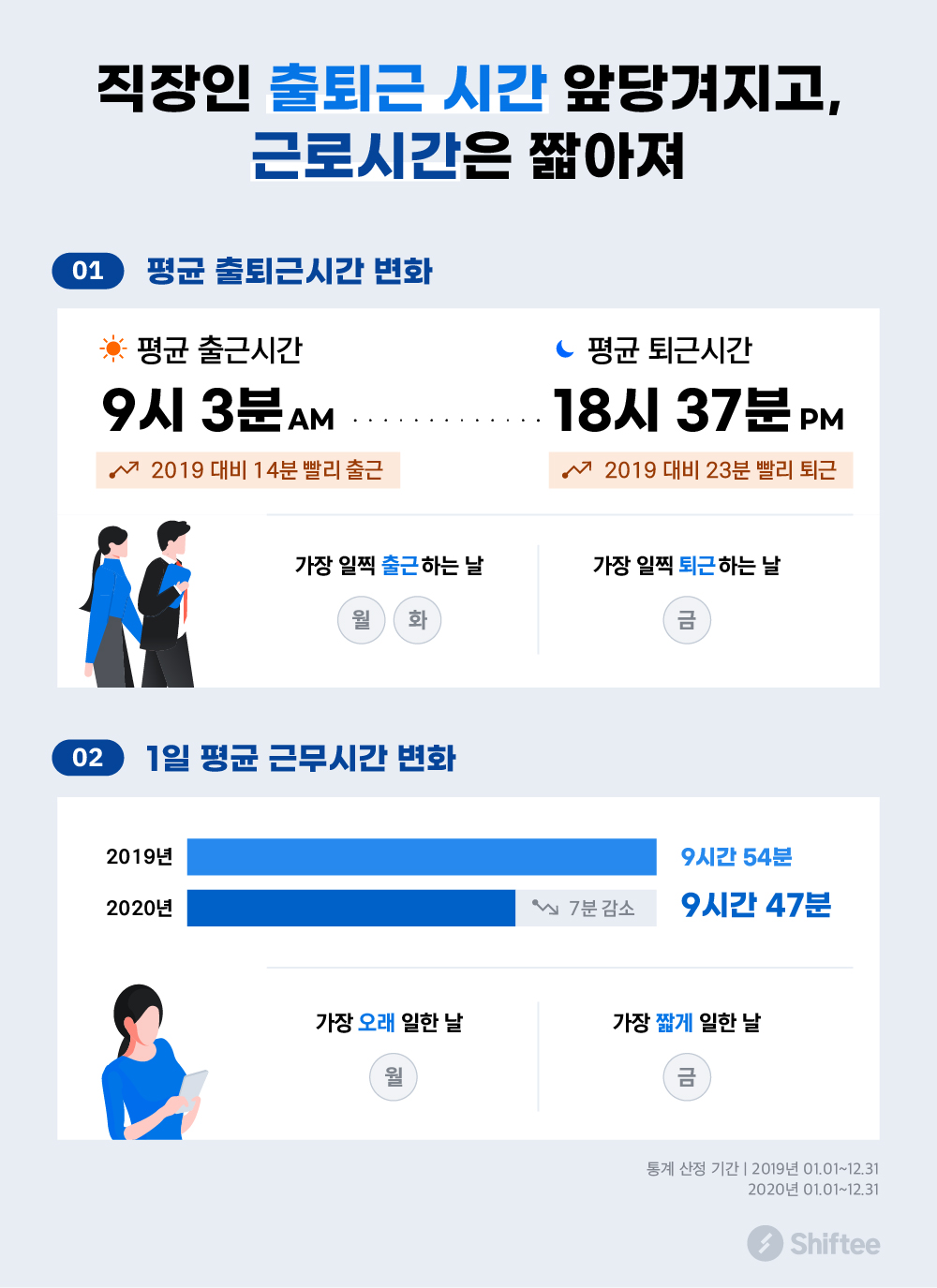 직장인들의 출퇴근 시간이 빨라졌다. 기업 인력관리 솔루션 기업 ‘시프티(대표 신승원)’가 자사의 근태관리 솔루션을 사용하고 있는 10만개 사업장 중 13,100개 기업의 출퇴근 및 근무시간 데이터 분석 결과를 16일 발표했다.