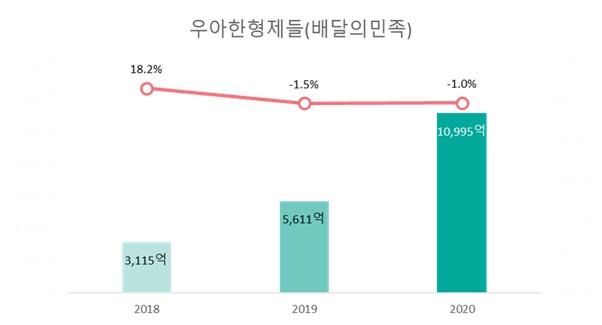 배달의민족은 코로나19 수혜기업 중 하나로 2020년, 전년 대비 95.9% 성장하면서 매출 1조 원을 최초로 돌파한 바 있다. 수수료 논란 및 딜리버리히어로 인수 등 여러 가지 쟁점이 있었음에도 불구하고 명실상부 대한민국 최고 스타트업으로의 저력을 보여준 것. 2019년 투자 및 경쟁 강화로 소폭 적자로 전환하였지만, 통제 가능한 수준의 적자로 운영하고 있음으로 보이고 있다.