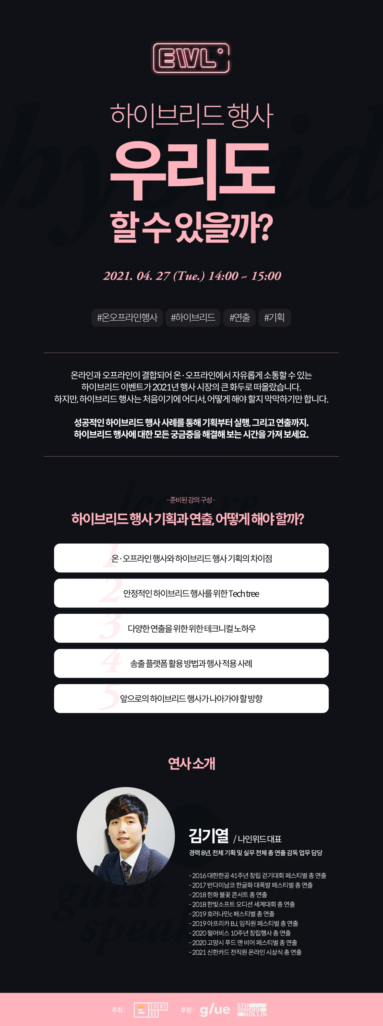 이벤터스가 주최하고 글루호텔, 스튜디오홀린이 후원하는 ‘[EWLº]이벤터스 웨비나 라이브:: 하이브리드 행사, 우리도 할 수 있을까?’가 오는 4월 27일 화요일 14시에 진행된다. 온라인 웨비나로 진행되는 이번 행사는 행사 기획자에게 하이브리드 행사의 기획과 실행, 연출에 대한 팁을 전하고자 마련되었다. 신한카드 전직원 온라인 시상식, 고양시 푸드 앤 비어 페스티벌 등 다양한 행사의 총 연출을 맡았던 나인위드 김기열 대표가 연사로 나서 하이브리드 행사 기획과 운영 전반에 관한 이야기를 전한다. 강의는 △온・오프라인 행사와 하이브리드 행사 기획의 차이점, △안정적인 하이브리드 행사를 위한 Tech tree, △다양한 연출을 위한 테크니컬 노하우, △송출 플랫폼 활용 방법과 행사 적용 사례, △앞으로의 하이브리드 행사가 나아가야 할 방향 순으로 진행된다. 웨비나에 대한 자세한 내용 확인과 참가 신청은 이곳에서 할 수 있다.