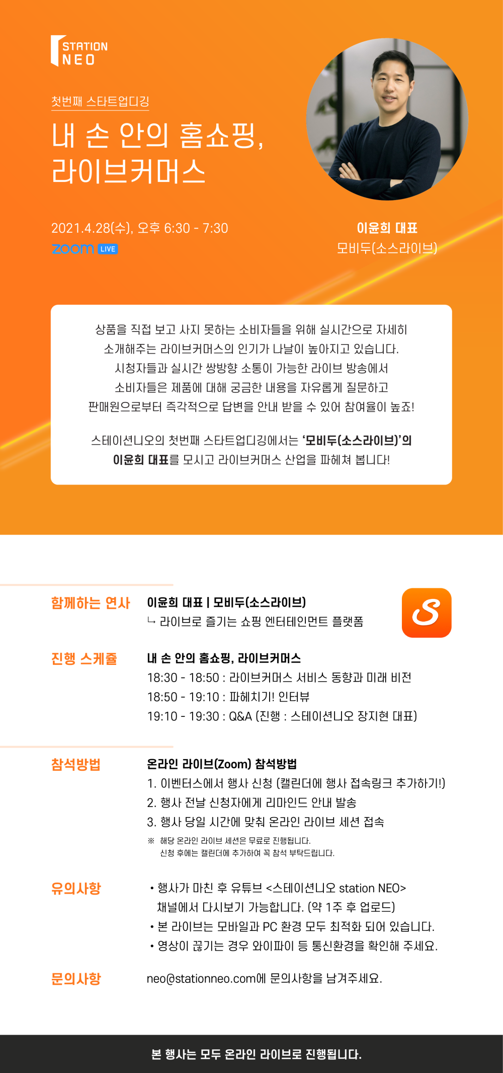 스테이션니오가 주최하는 ‘[스테이션니오] 첫번째 스타트업디깅 : 모비두(소스라이브)편’가 오는 4월 28일 수요일 18시 30분에 진행된다. 온라인 웨비나로 진행되는 이번 행사는 라이브커머스 산업의 동향을 알아보고자 마련되었다. 라이브로 즐기는 쇼핑 엔터테인먼트 플랫폼인 모비두(소스라이브)의 이윤희 대표가 연사로 나서 라이브커머스에 대한 다양한 이야기를 전할 예정이다. 행사는 △라이브커머스의 서비스 동향과 미래 비전, △인터뷰, △Q&A 순으로 진행된다. 스타트업과 라이브커머스 산업에 관심이 있는 누구나 참여할 수 있다. 웨비나에 대한 자세한 내용 확인과 참가 신청은 이곳에서 할 수 있다.