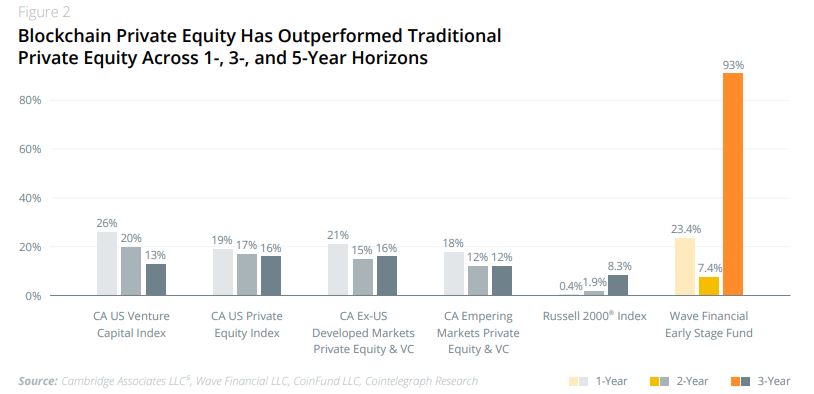 투자 증가 원인 중 하나는 암호화폐·블록체인 산업이 가진 높은 잠재 수익률이다. 블록체인 전문 투자 펀드는 지난 7년 동안 일반 투자 펀드 실적을 능가했다.